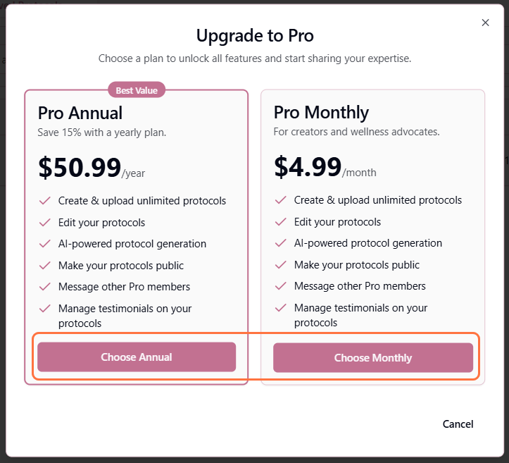 - 2The Pro subscription modal will appear with both plan options. Click "Choose Monthly" or "Choose Annual" for your preferred plan: Pro Monthly ($4.99/month) or Pro Annual ($50.99/year)