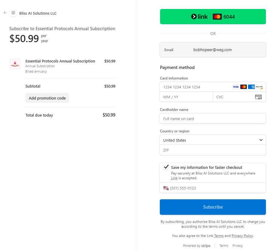 - 4Review your details, update payment method if needed, and click "Subscribe"