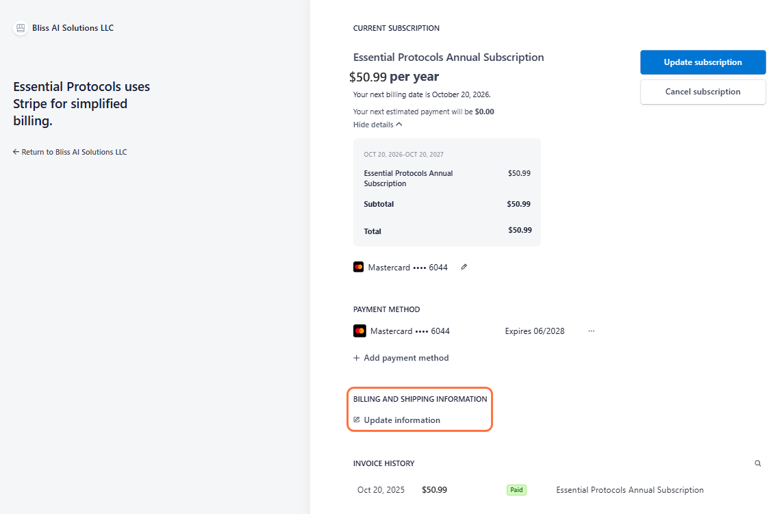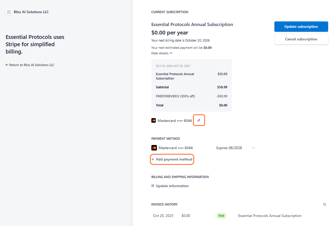 You can update your payment method, billing address, and other payment details at any time through the Stripe customer portal. This is useful when your card expires, you want to use a different payment method, or your billing information changes.