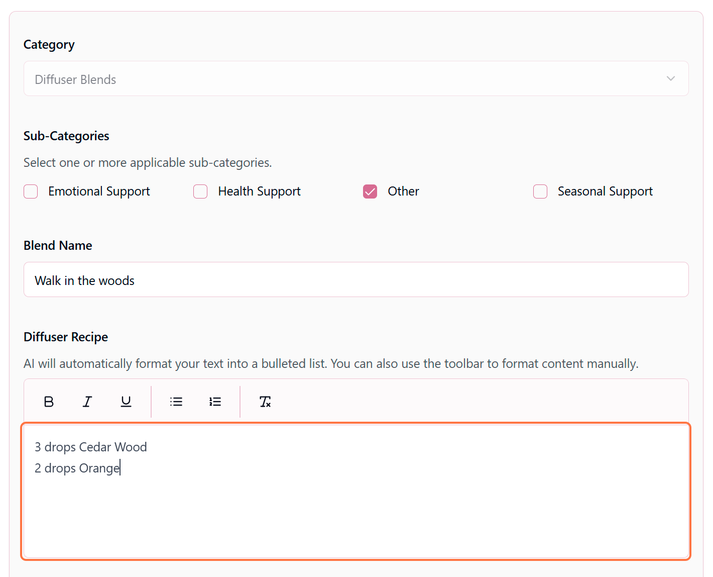 - 3Select a sub-category from the dropdown (Required). For diffuser blends, the "Emotions" category is often most appropriate, but choose what best fits your blend's purpose.