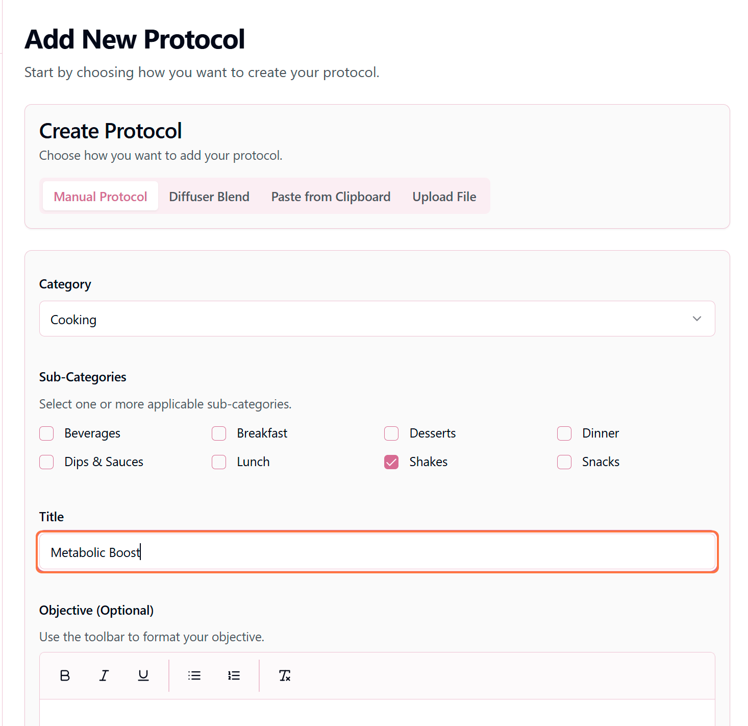 Creating a protocol manually gives you complete control over every detail. This method is perfect when you want to document a custom wellness solution, share a favorite remedy, or build a comprehensive protocol from scratch.