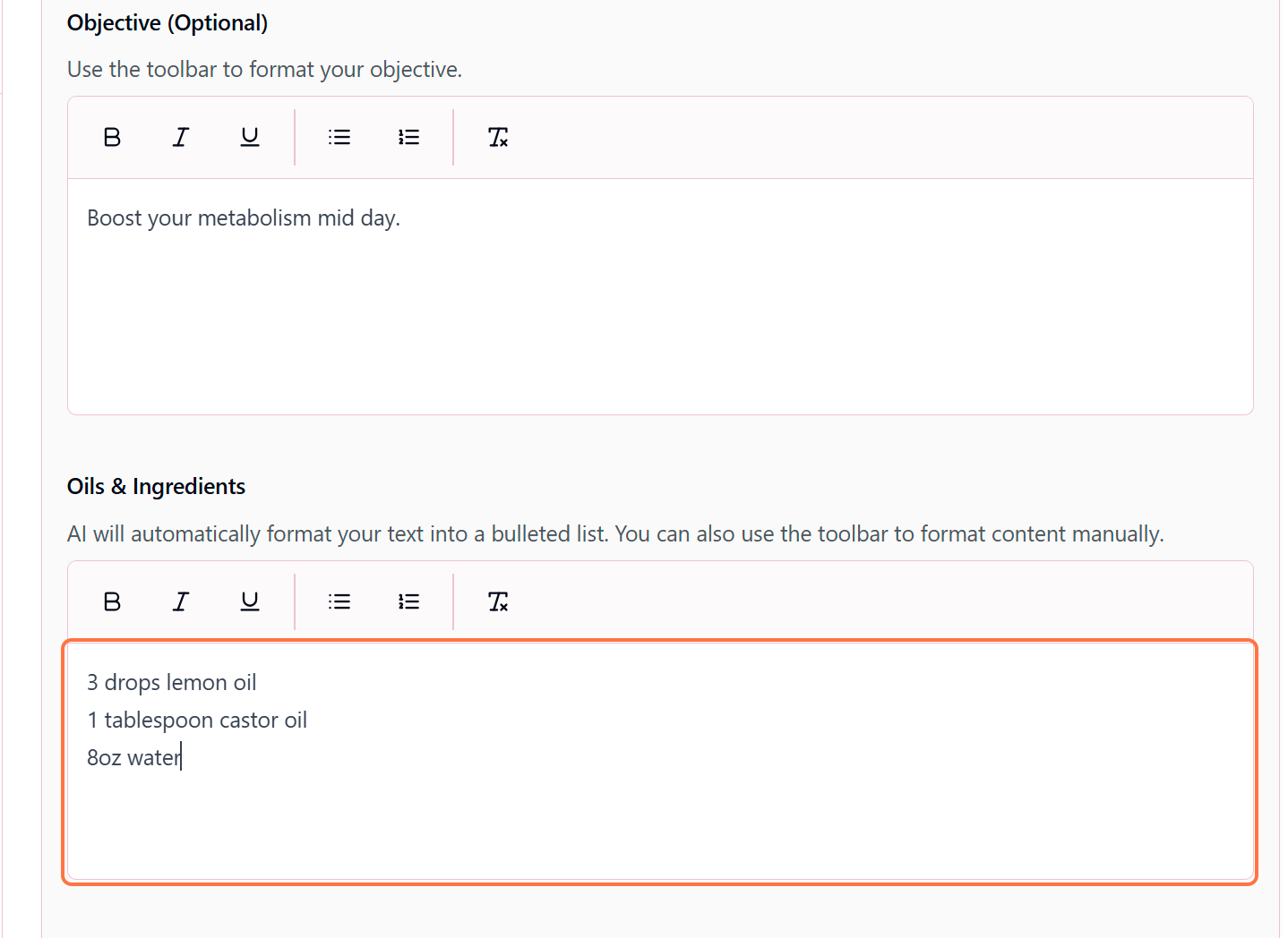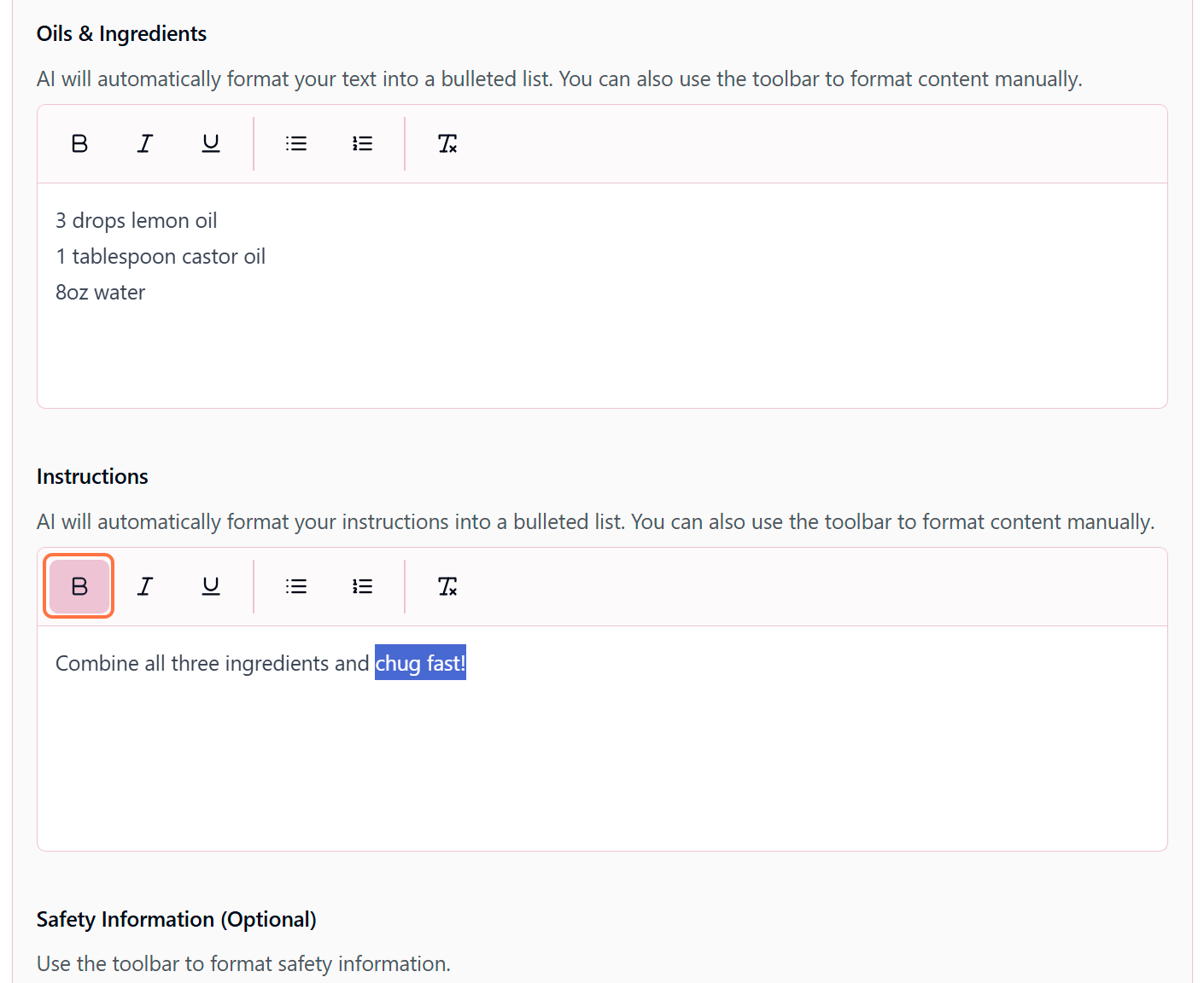 Required field. You can use the formatting buttons, or the AI will automatically create a bullet list for you.
