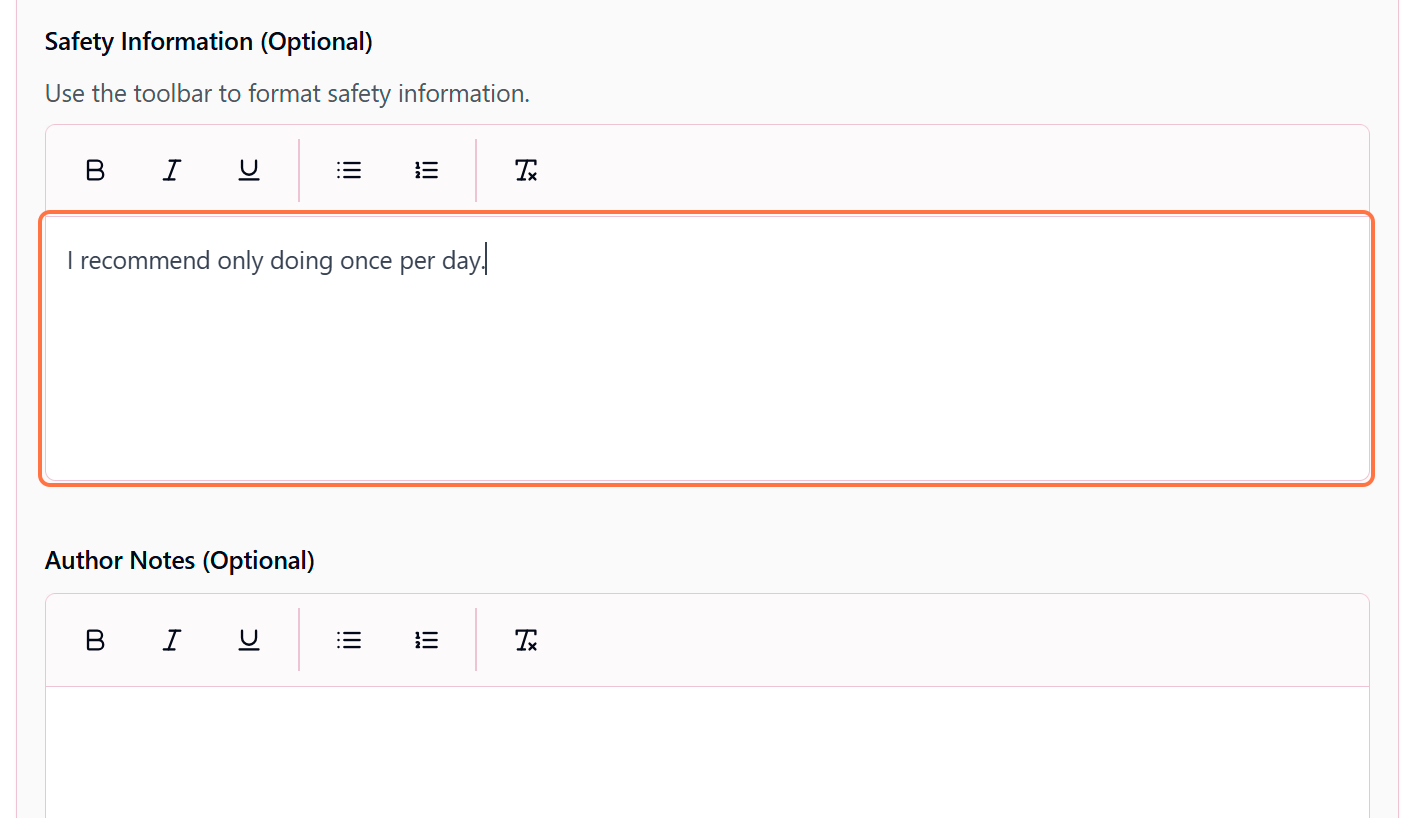 Optional field. By default, all protocols include a standard FDA disclaimer. Add specific safety notes like "Avoid during pregnancy" or "Not for children under 6."