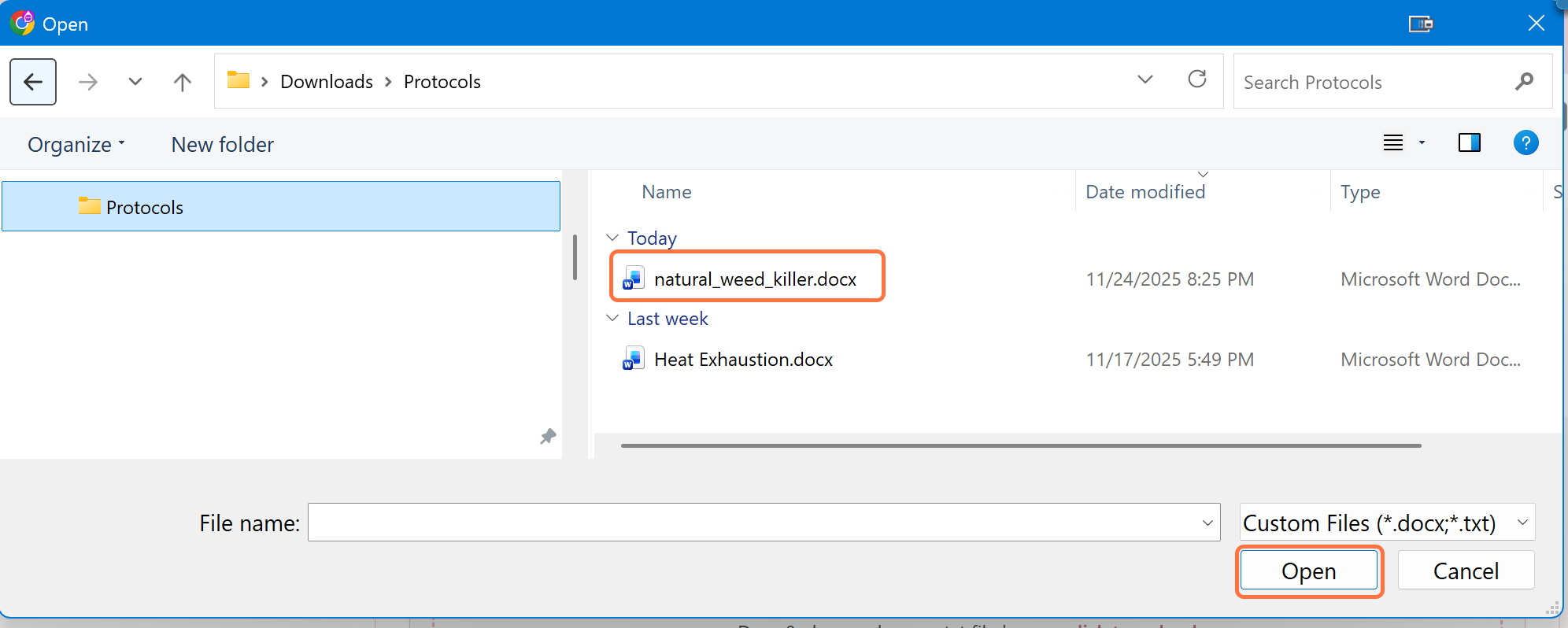 Uploading a document is the perfect solution when you have protocols already formatted in Word, PDF, or other document formats. This method preserves your formatting and allows you to import complete, polished protocols with minimal effort.