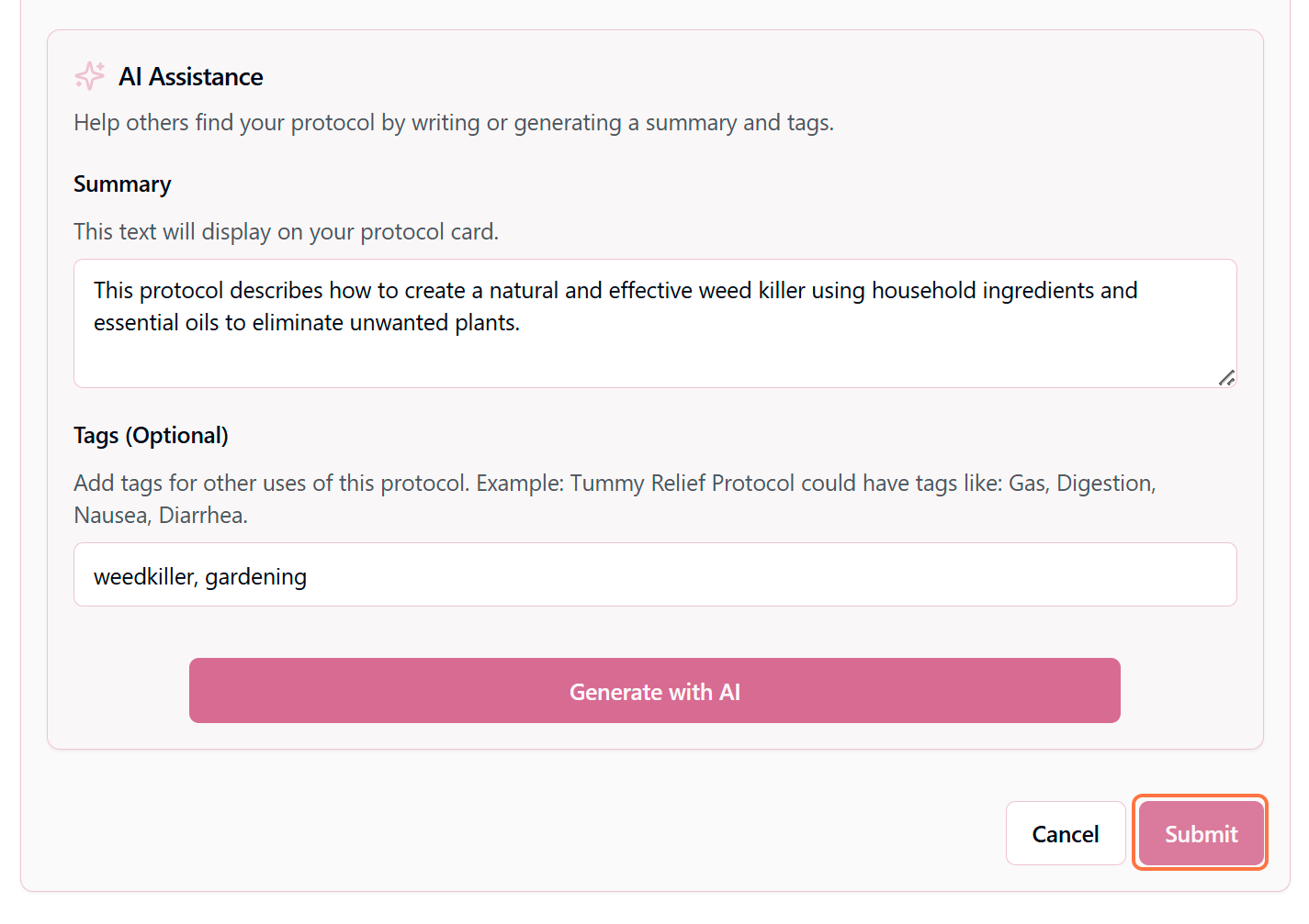 - 3Review the parsed protocol information and make any necessary adjustments. click "Generate With AI". Your information will be reviewed and the Summary, & Tags will be generated automatically. When you're ready, click "Submit".